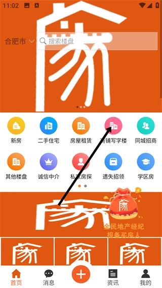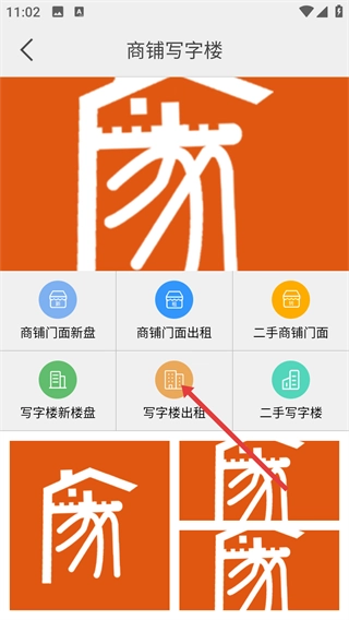 1、在首页点击【商铺写字楼】选项,即可进入商铺与写字楼相关的分类功能页面,此页面包含多种房产服务入口。