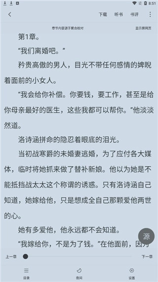 5、最后点击“阅读”进入,就能看到精彩的书籍内容啦!这里有超多功能,支持选择数源、加入书架,还能调整亮度、设定阅读背景哦!