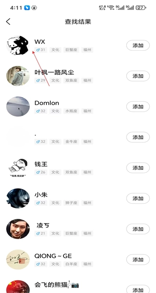 3、进入查找结果页面后,若看到多个符合条件的用户,选择其中的WX,点击进入其资料详情页面。
