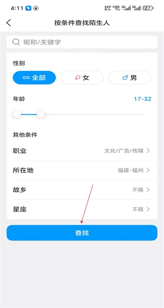 2、进入按条件查找页面后,可选择性别、年龄等筛选条件,设置完成后点击查找按钮,即可获取符合条件的用户列表。