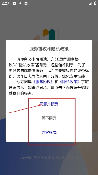 1、当弹出【服务协议和隐私政策】窗口时,你可以点击【同意并接受】来开启服务,也可以选择【游客模式】进入使用;不过在进行这些操作前,建议先仔细了解协议的具体内容。