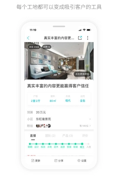 2、工地营销方面,每个工地都能成为可互动的内容载体,潜在客户能够在线围观并参与到整个装修流程中,这既可以作为线上自我推广、营销谈单的获客工具,也能用于线下场景。