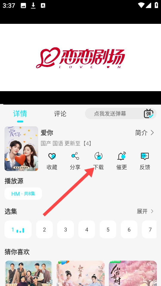 1、打开火花剧场,挑选一部电视剧并点击播放,在播放界面中找到“”按钮。