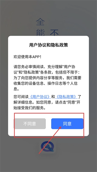 1、仔细阅读《用户协议》与《隐私政策》,在知晓应用所需收集的设备信息等相关内容后,点击【同意】按钮,即可进入“全能配音王”应用。