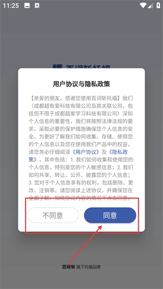 1、进入后会弹出【用户协议与隐私政策】,阅读相关内容后,点击弹窗中的【同意】按钮,就能继续使用百词斩托福相关功能。