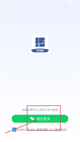 2、进入登录页面,此页面仅对18周岁及以上的成年人开放使用,点击【微信登录】按钮,就能完成百词斩账号的登录流程。