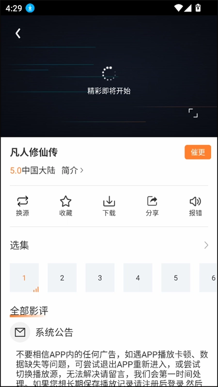 4、点击任意影片即可开始播放。另外,界面上还设有换源、收藏、缓存、分享、反馈等功能按钮,既贴心又实用。