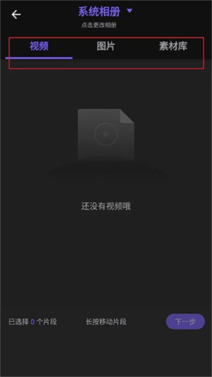 2、在新建影片的界面里,您能够添加视频、图片以及素材库中的各类素材。