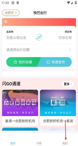 1、打开快巴出行的首页,能看到出发地和到达地的输入框,还有闪GO通道,接着点击“我的”进入个人中心页面。