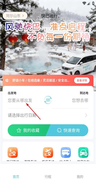 4、回到首页并切换城市后,找到出发地和到达地的输入区域,准备填写相关信息来查询行程。