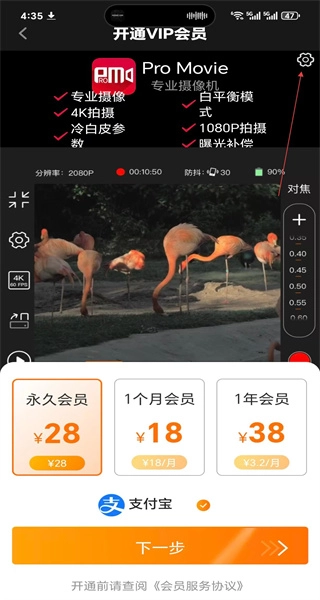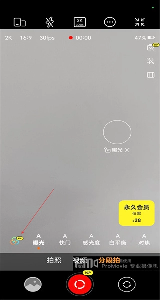 1、启动软件进入拍摄界面后,能看到曝光、快门等功能选项,点击左下角的VIP入口,即可进入会员开通页面。