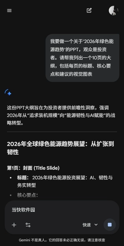 Gemini将提供逻辑严密的结构、每页的具体文案,以及图片或数据放置位置的建议,大家可根据自身实际需求进行修改。