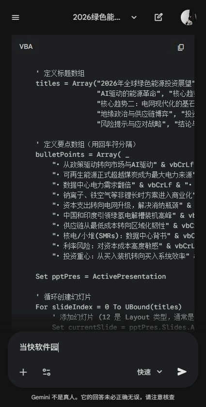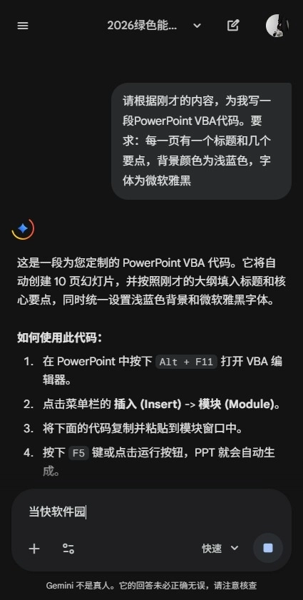 1、你能够让Gemini编写一段VBA代码,直接在PowerPoint里运行来生成幻灯片。