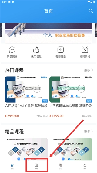 1、在首页界面,点击底部的课程分类按钮,进入课程筛选页面,可查看不同类别的课程资源。