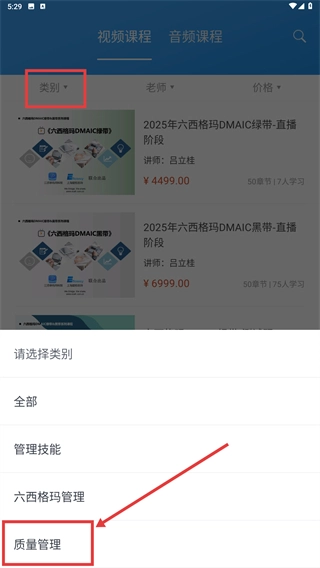 2、进入课程筛选页面后,点击【类别】下拉菜单,选择【质量管理】分类,即可筛选出该类别下的课程。