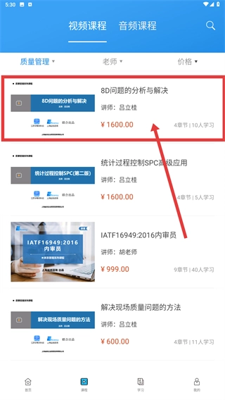 3、在【质量管理】课程列表中,找到目标课程(例如【8D问题的分析与解决】),点击进入该课程的详情页面。
