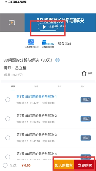 4、在课程详情页面,点击【试听】按钮就能体验课程内容,也可以通过【加入购物车】或者【立即购买】这两个选项来完成课程的选购。