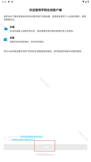 1、仔细阅读【学院在线客户端】的使用提示,确认理解后勾选同意相关协议,然后点击【同意】按钮,即可进入后续操作步骤。
