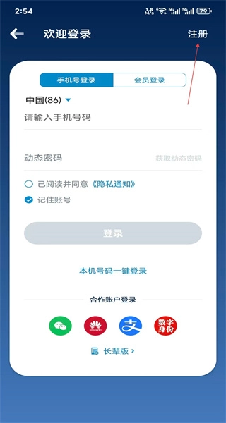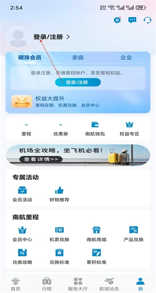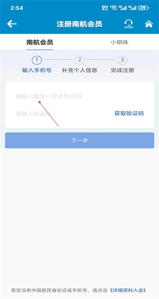 3、在登录界面,点击右上角的注册按钮,即可进入南航会员注册的操作流程页面。