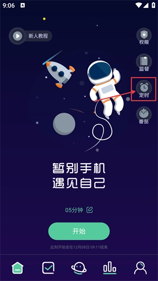 进入界面后,能够查看【新人教程】【权限】【定时】等功能,接着点击【定时】选项。