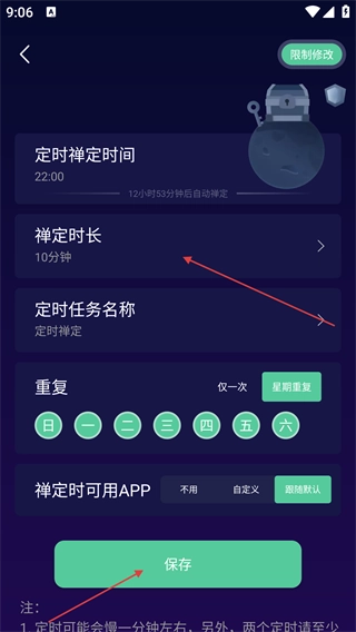 3、进入配置界面后,对【定时禅定时间】-【禅定时长】等相关参数进行调整,待设置完毕,点击【保存】按钮,即可完成定时禅定的配置操作。