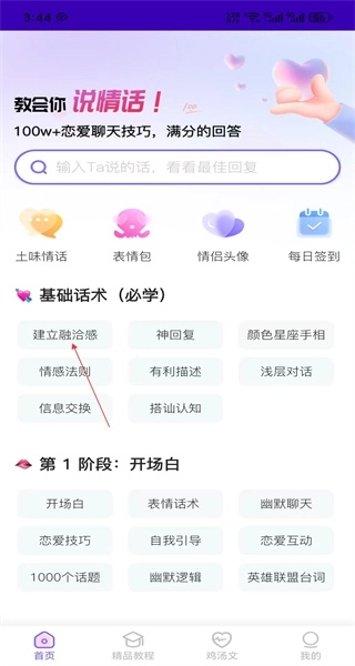 1、启动软件后,进入主页面,找到基础话术的分类,点击“建立融洽感”选项进入相应页面。