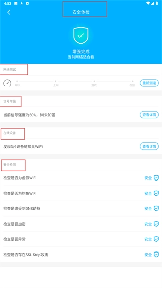 4、借助【安全体检】功能,能够实现网络优化、信号检测、在线设备查看以及多项安全检测(例如虚假WiFi、钓鱼WiFi的排查),以此保障网络安全。