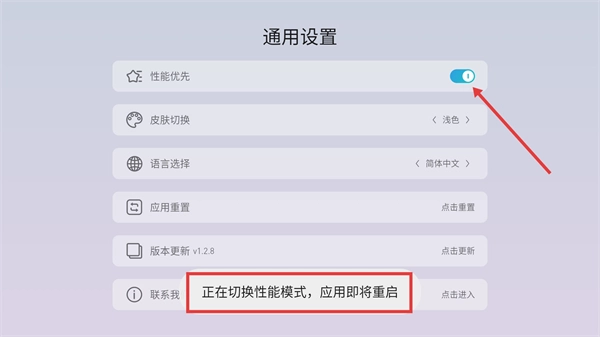 3、点击【性能优先】的开关后,应用会弹出提示“正在切换性能模式,应用即将重启”。