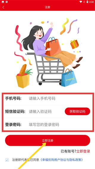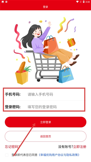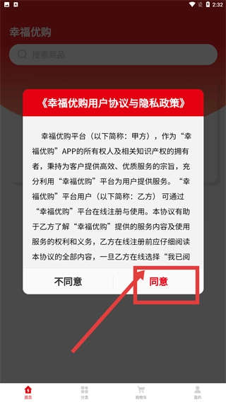 1、在【幸福优购】启动时,阅读《用户协议与隐私政策》后,点击“同意”按钮,即可完成协议确认并进入后续流程。