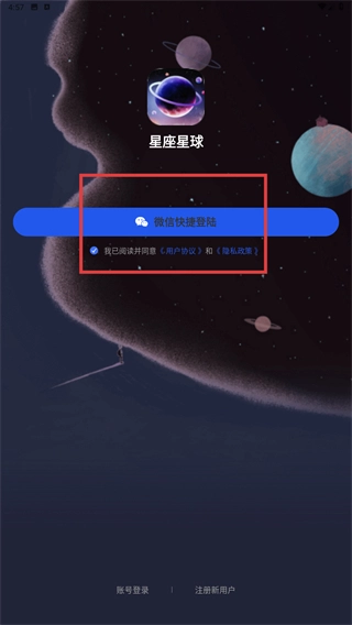 2、选择“微信快捷登录”时,请确认已勾选《用户协议》和《隐私政策》,然后点击对应的按钮,通过微信账号完成登录操作。