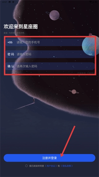 4、如需注册新用户,在注册页面依次填写账号、设置并确认密码,勾选相关协议后点击“注册并登录”按钮,即可完成账号的创建与登录操作。