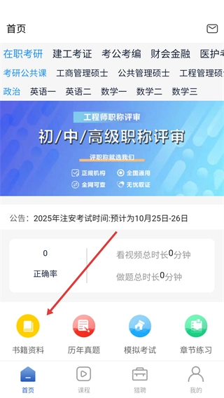 1、在首页可以借助分类标签来选定备考方向,点击【书籍资料】的入口,就能进入资料选购页面,并且还能查看学习数据的统计情况。