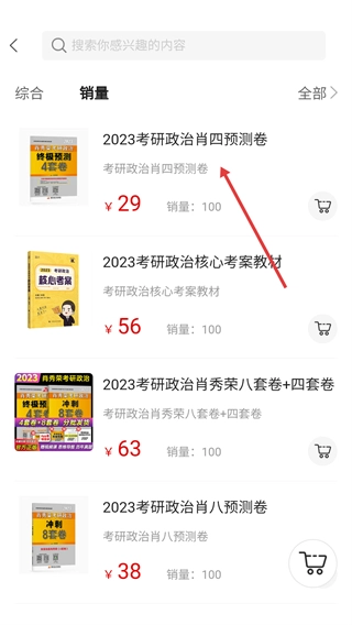 3、在按销量排序后的列表里,找到目标资料(例如【2023考研政治肖四预测卷】),点击对应的条目就能进入该资料的详情页面。