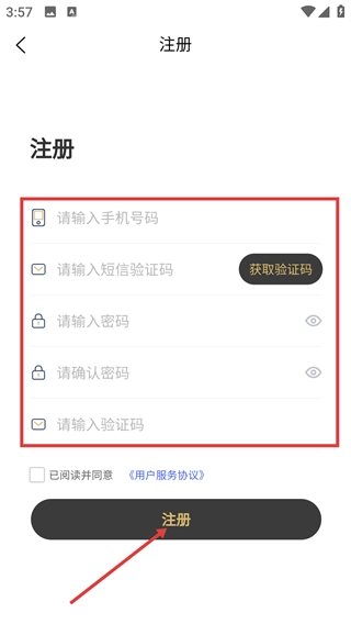 3、进入注册页面后,按顺序填写账号、短信验证码、密码等信息,勾选相关协议,然后点击【注册】按钮,即可完成账号注册操作。