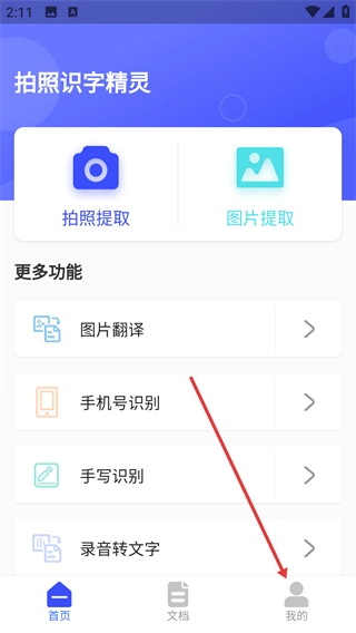 1、点击界面底部的【我的】选项,即可进入个人中心页面,并且能查看首页的【拍照提取】【图片提取】等功能。