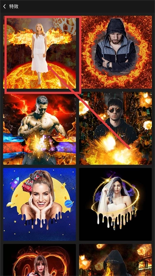 2、进入特效选择页面后,挑选你想要的特效模板(比如带有火焰翅膀的素材),点击该模板即可进入特效编辑环节。