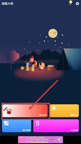 1、在【修图大师】的主界面中,找到并点击“照片特效”按钮,即可进入特效选择页面,在该页面可以挑选多种风格化的特效素材。