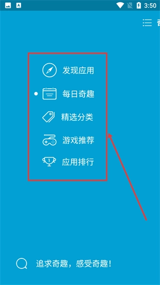 2、打开菜单后,能选择【发现应用】【每日奇趣】等选项,进入相应功能模块,以满足不同的使用需求。