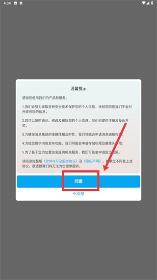 1、打开应用后,当弹出【温馨提示】窗口时,仔细阅读其中的相关协议内容,然后点击【同意】按钮,即可进入后续操作流程。