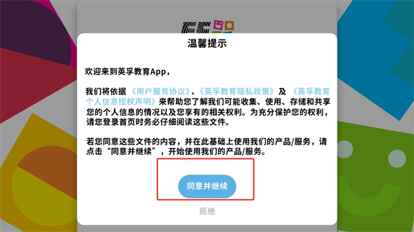 1、首先打开应用,点击弹出的温馨提示中的“同意并继续”按钮
