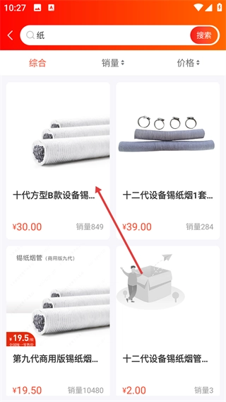 2、在搜索框里输入【纸】,点击右边的【搜索】按钮,就能看到相关商品的搜索结果了。