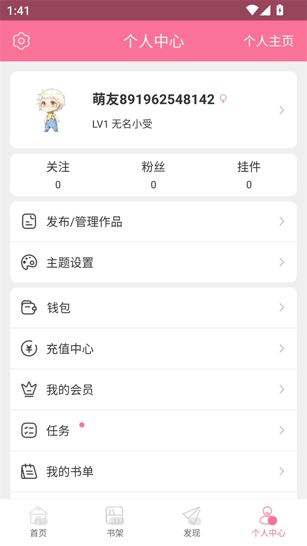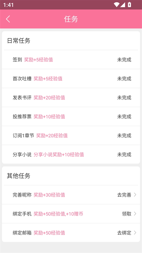 4、在“我的”页面找到“任务”入口,通过完成签到、发布评论、撰写书评等任务就能获取奖励。