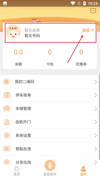 2、进入【我的】页面后,顶部会展示个人信息区域,点击【编辑】按钮可以完善个人信息,此外还能使用【停车账单】-【车辆管理】等相关功能。