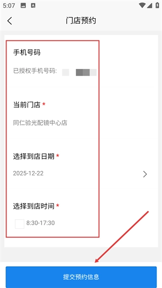 4、在【门店预约】页面,先确认【当前门店】的信息,接着选择【到店日期】和【到店时间】,之后点击【提交预约信息】,即可完成操作。