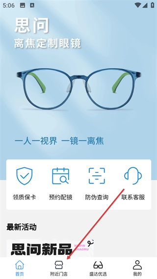 1、进入【思问-离焦定制眼镜】页面后,你可以使用【领质保卡】【预约配镜】等功能,还能点击底部的【附近门店】进入相应页面。