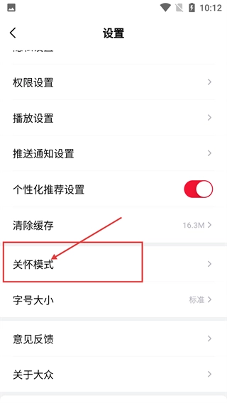 3、进入【设置】页面后,找到并点击【关怀模式】选项,即可进入该模式的功能介绍及操作界面。