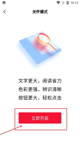 4、进入【关怀模式】页面后,点击【立即开启】按钮,就能启用该模式,享受更大字号等更便捷的使用体验。