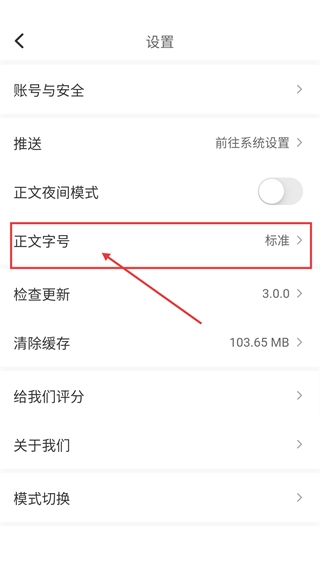 3、进入设置页面后,找到“正文字号”选项并点击,即可进入字体大小的设置界面。