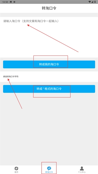 2、进入【转淘口令】页面后,先在输入框中填写所需内容,随后可选择点击【转成我的淘口令】,也可先选定字符格式,再点击【转成“”格式的淘口令】,即可完成淘口令的转换操作。