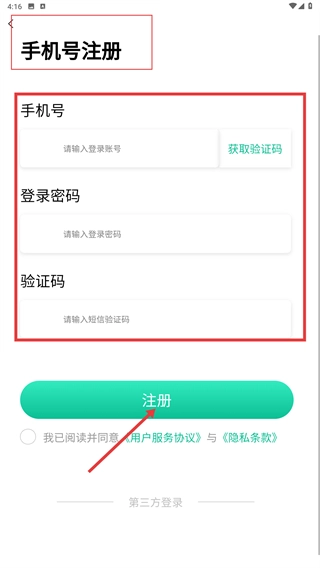 3、若没有账号,可点击【注册】按钮进入账号注册页面,接着输入账号、设置登录密码、获取并填写验证码,勾选相关协议后,再次点击【注册】即可完成账号创建。